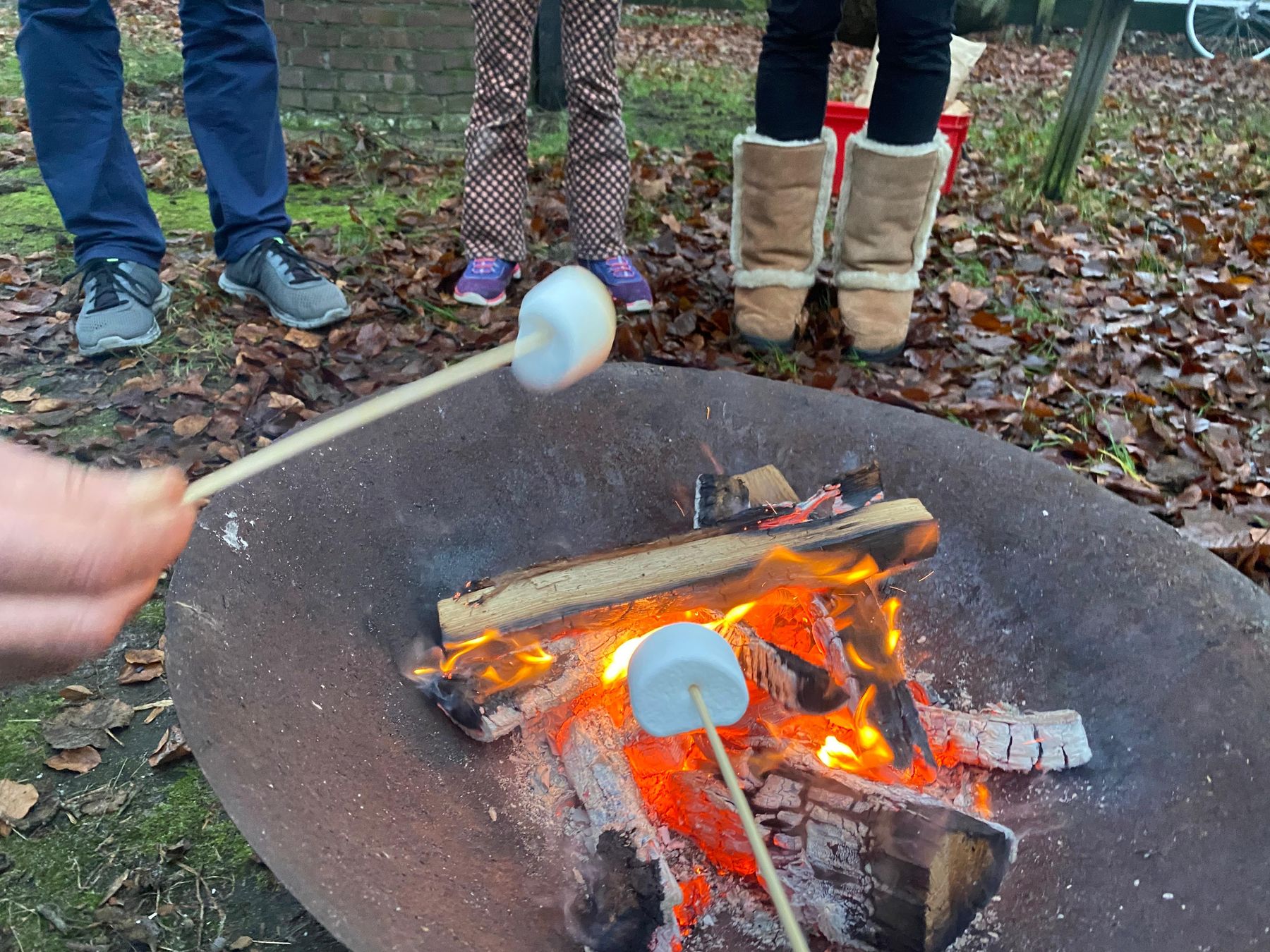 Voor de kinderen is er warme chocomelk en zij kunnen weer Marshmallows smelten in het vuur.