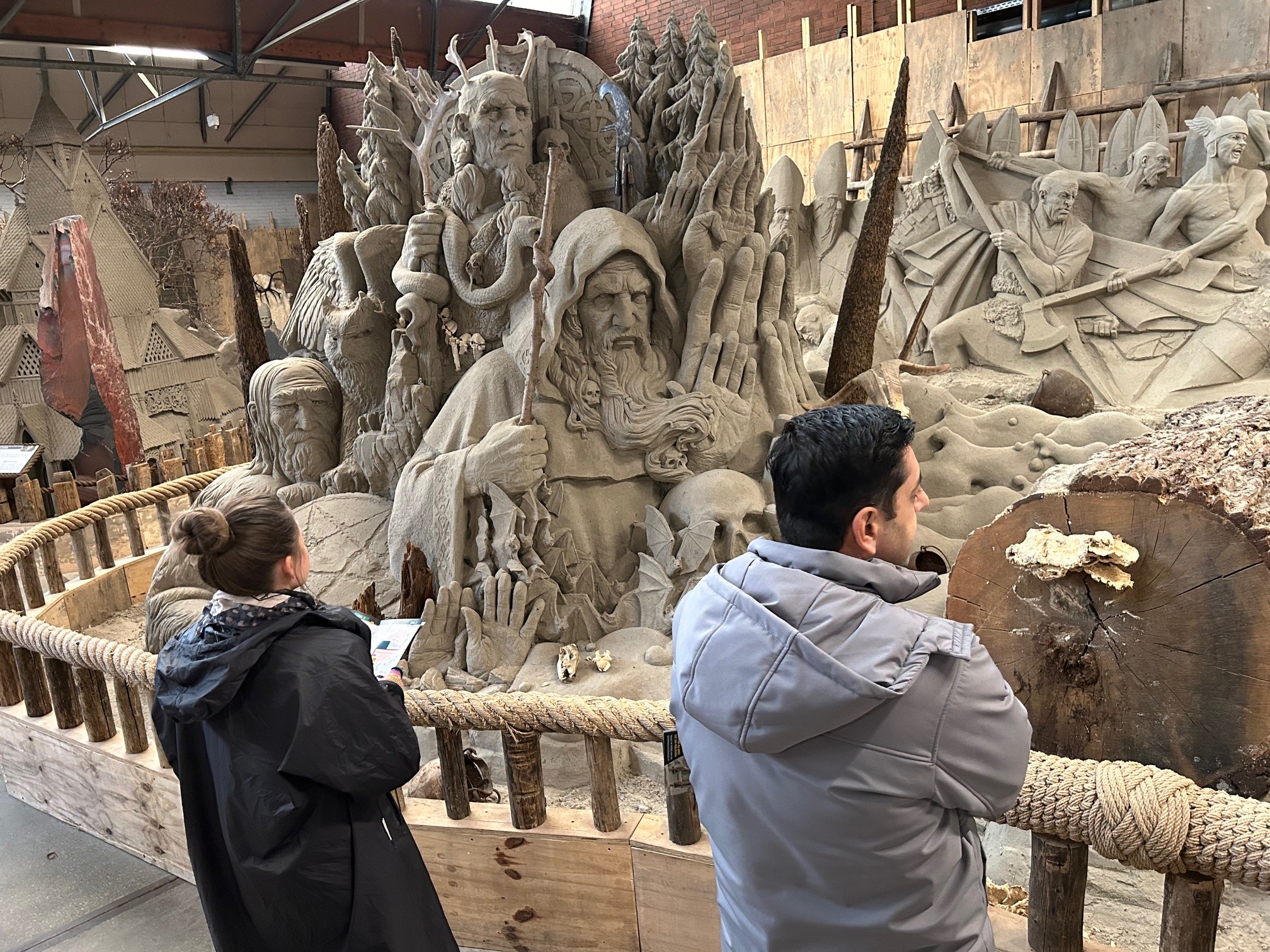Onze dag begon bij Zandverhalen Elburg – de grootste overdekte zandsculpturenexpositie ter wereld. En dat voel je meteen bij binnenkomst. Een oppervlakte van maar liefst 5.000 vierkante meter, gevuld met 4.000 kuub zand, 300 sculpturen en 100 eeuwenoude verhalen: van Bijbelse taferelen tot klassieke mythen en Hollandse en Elburgse historie. Elk detail is met ongelooflijke precisie en vakmanschap geboetseerd. We liepen langs de scènes en verbaasden ons over hoe realistisch de ontwerpen eruit zagen.