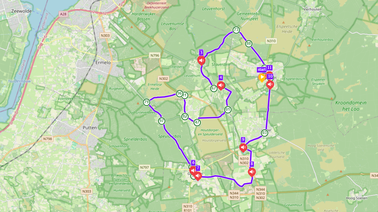 Ontdek het Veluwse boerenland op de fiets. Deze route voert je langs karakteristieke erven, eeuwenoude akkers en dorpen vol verhalen. Bij tien historische plekken luister je via audiopalen naar verhalen over generaties boeren die hier leefden en werkten. Van de waaiervormige akkers en molenverhalen in Garderen, tot de eeuwenoude enken bij Meerveld en de compleet behouden boerenerven in Staverden, het kleinste stadje van Nederland. Een route vol landschap, historie en levende tradities.