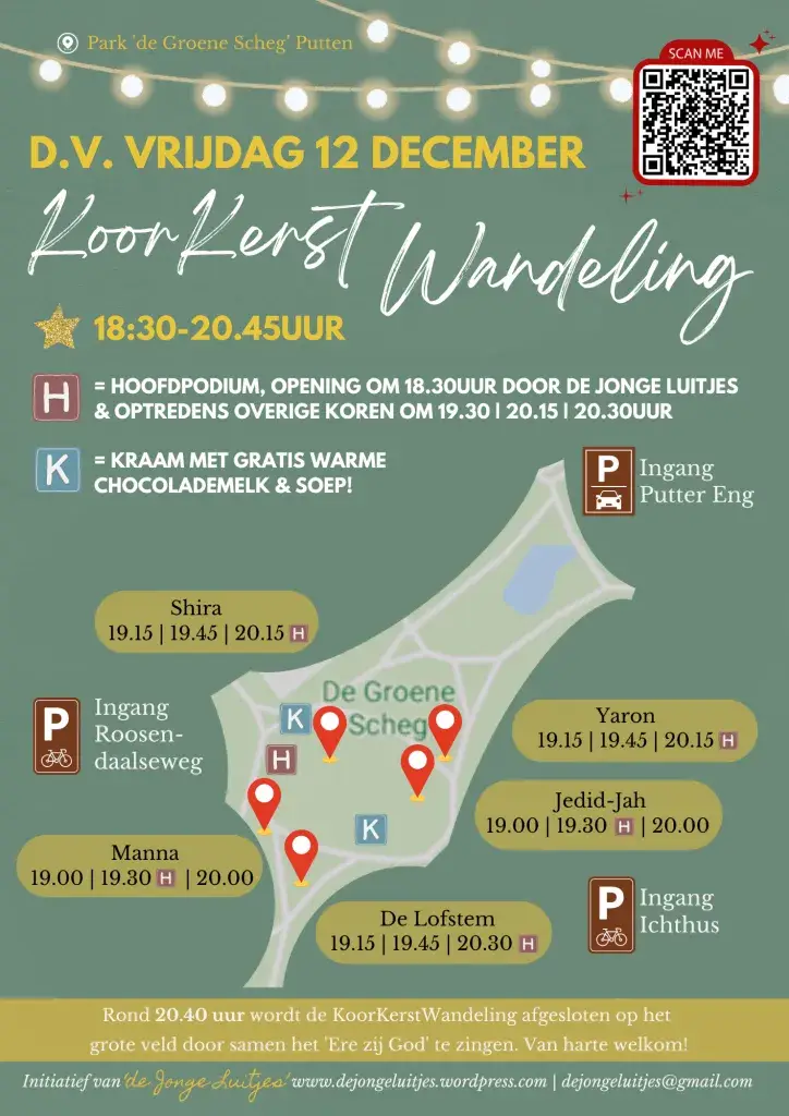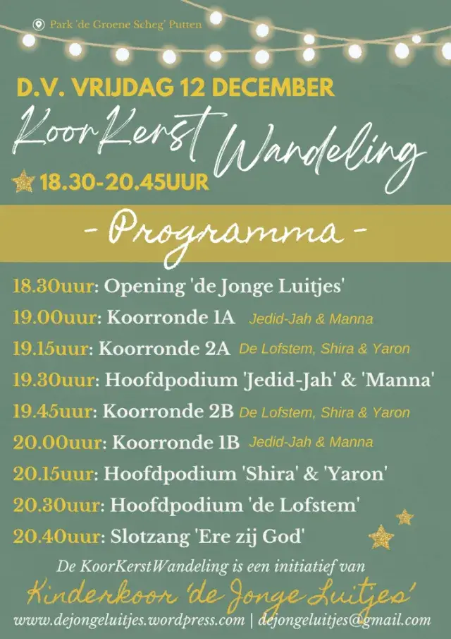 De Jonge Luitjes, een kinder- en tienerkoor, organiseert ook in 2025 weer de gezellige KoorKerstWandeling. Alle koren treden op hun eigen locaties op. Zo is er genoeg te beleven voor jong en oud. Een mooie manier om de kerstsfeer te proeven!