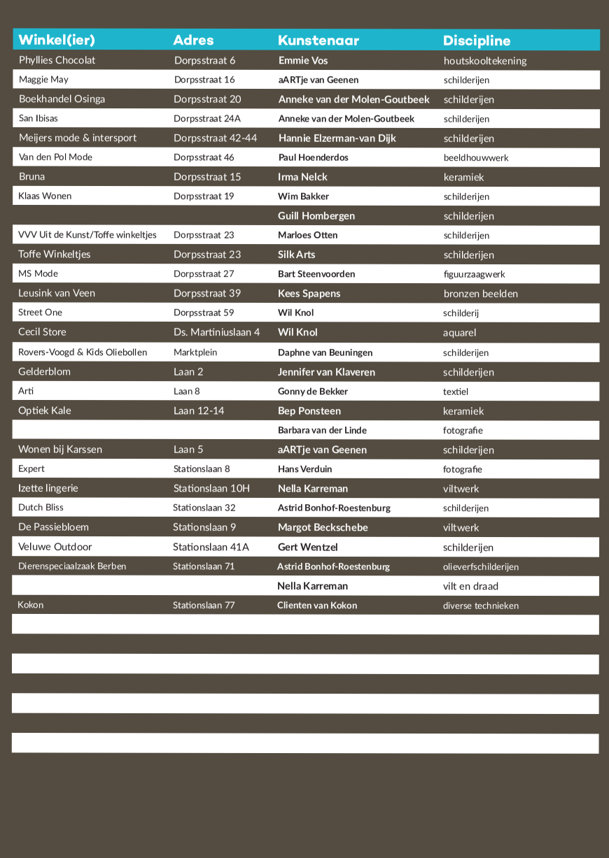 Wil je weten waar de kunstwerken te vinden zijn? Haal dan de brochure met lijst van deelnemende winkels vanaf begin december bij VVV Nunspeet.