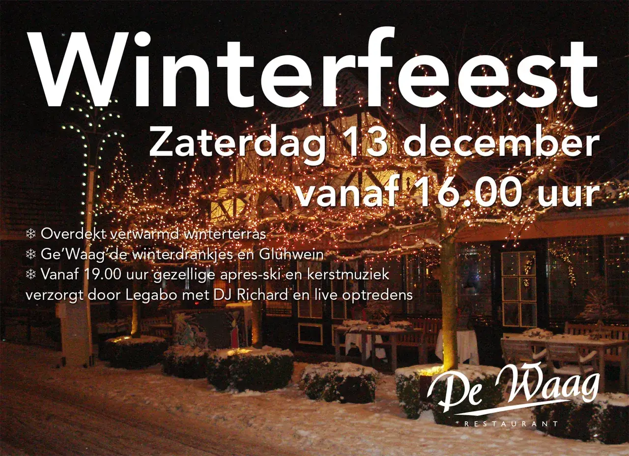 Vier de winter en kom in kerstsfeer bij restaurant De Waag. Geniet van een overdekt winterterras, winterdrankjes, Glühwein en gezellige après-ski en kerstmuziek.