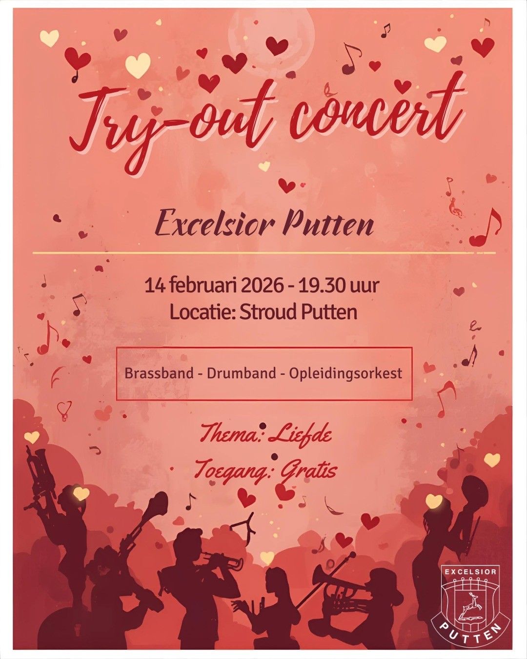 Excelsior houdt een try-out concert in Cultureel Centrum Stroud in Putten. De fanfare laat zich horen als brassband met een vleugje romantiek. De koperklanken van de brassband smelten samen met de liefde, want het is bijna Valentijnsdag. Niet alleen het grote orkest laat van zich horen. De energieke slagwerkgroep en de aanstormende talenten van het opleidingsorkest zorgen voor een gevarieerd programma.