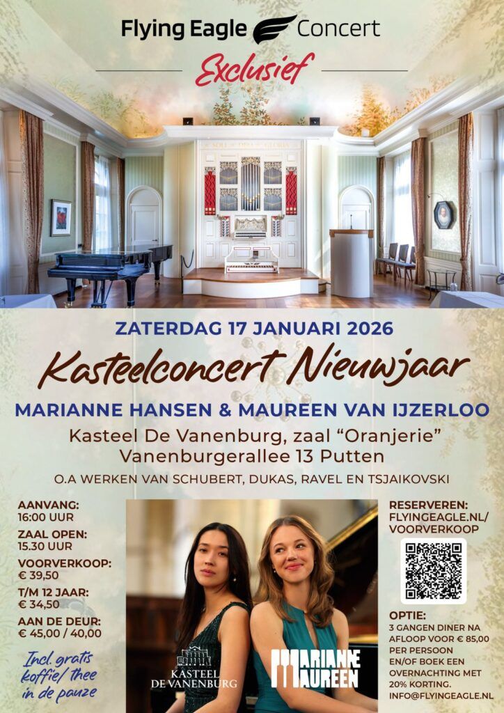 Vanwege het slechte weer is de voorstelling van 17 januari verplaatst naar 28 maart aanvang 20:00 uur. Beleef een sprankelende muzikale middag in de ‘Oranjerie’ bij Kasteel De Vanenburg tijdens het concert van het veelgeprezen pianoduo Marianne Hansen en Maureen van IJzerloo. Ze brengen onder ander werken van Schubert, Dukas, Ravel en Tsjaikovski ten gehore.