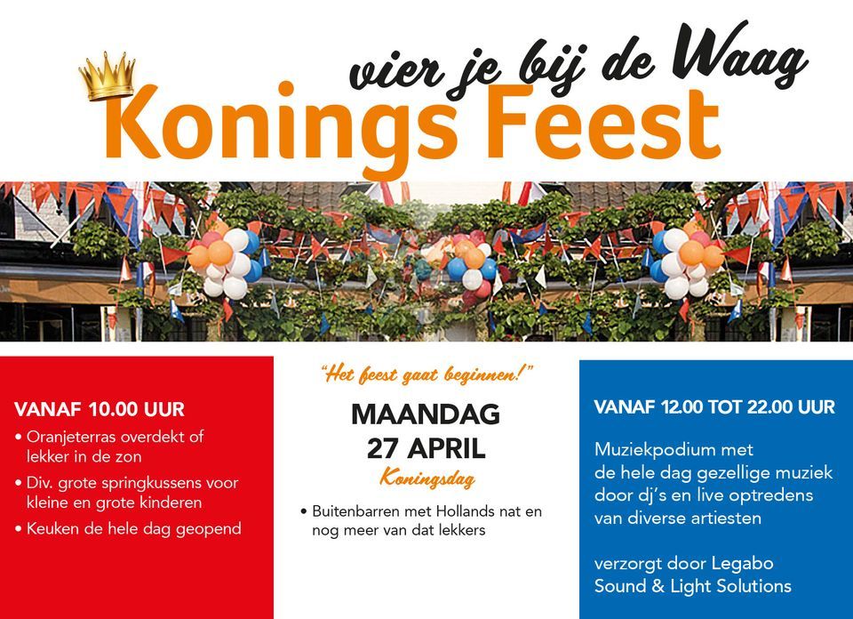 Op 27 april 2026 vindt het Koningsfeest bij De Waag in Putten plaats. Vanaf 10:00 uur is er feest met een overdekt en zonovergoten terras. Voor kinderen zijn er springkussens en de keuken is de hele dag geopend. Van 12:00 tot 22:00 uur is er muziek van dj’s en live artiesten.