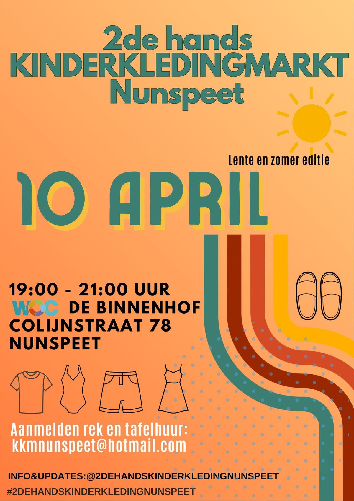 De kinderkledingmarkt is een leuke plek om te komen. Je kunt er leuke kleding vinden voor je kinderen, of zelf spullen verkopen. Kom gezellig langs op 10 april bij WOC de Binnenhof. Tot dan!