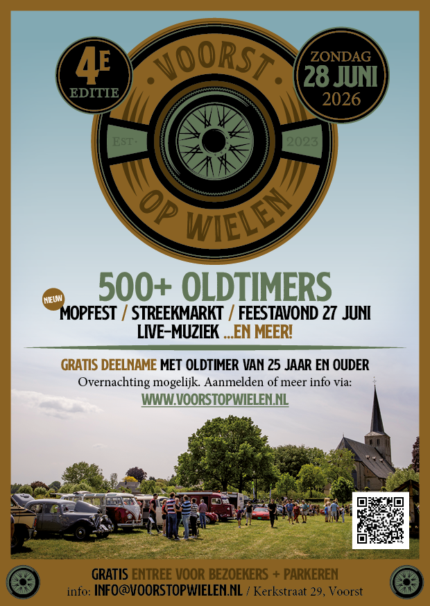 Op zondag 28 juni vindt de 4e editie van oldtimerdag Voorst op Wielen plaats. Met meer dan 500 oldtimers en verscheidenheid aan activiteiten is dit een geweldig dagje uit voor het hele gezin! Naast oldtimer tractoren, auto’s, motoren, bromfietsen en vrachtauto’s zijn ook stationaire motoren van harte welkom. En ze zijn niet alleen te zien, maar ook te horen en ruiken… dat maakt Voorst op Wielen een uniek en ongeëvenaard evenement voor oldtimers van 25 jaar en ouder.