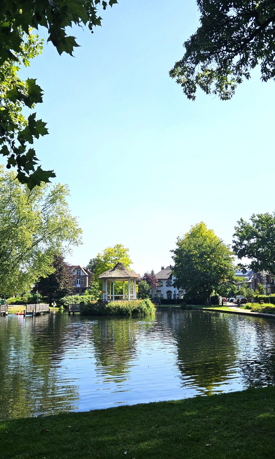 Een schilderachtig wateroppervlak in Veluwezoom, Rheden, nabij villapark Overbeek, omgeven door groene bomen