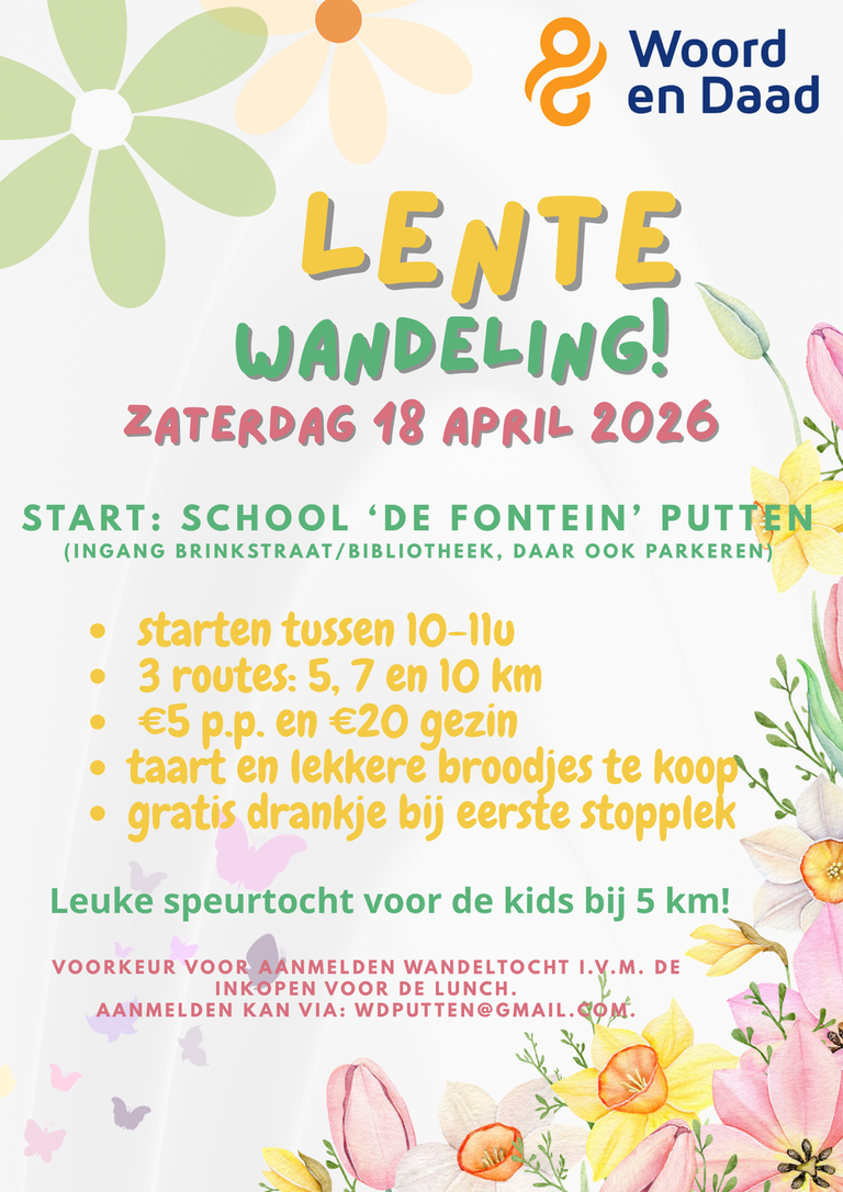 De Lentewandeling van Woord en Daad Putten start bij "Basisschool de Fontein" (ingang Brinkstraat/bibliotheek). Er is keuze uit 5, 7 of 10 km, met een speciale speurtocht voor kinderen op de 5 km-route. Bij de tussenstop en/of aan het einde zijn koffie, thee, fris, taart en belegde broodjes te koop. Een gratis drankje is inclusief bij de eerste stopplek. Aanmelden via wdputten@gmail.com.